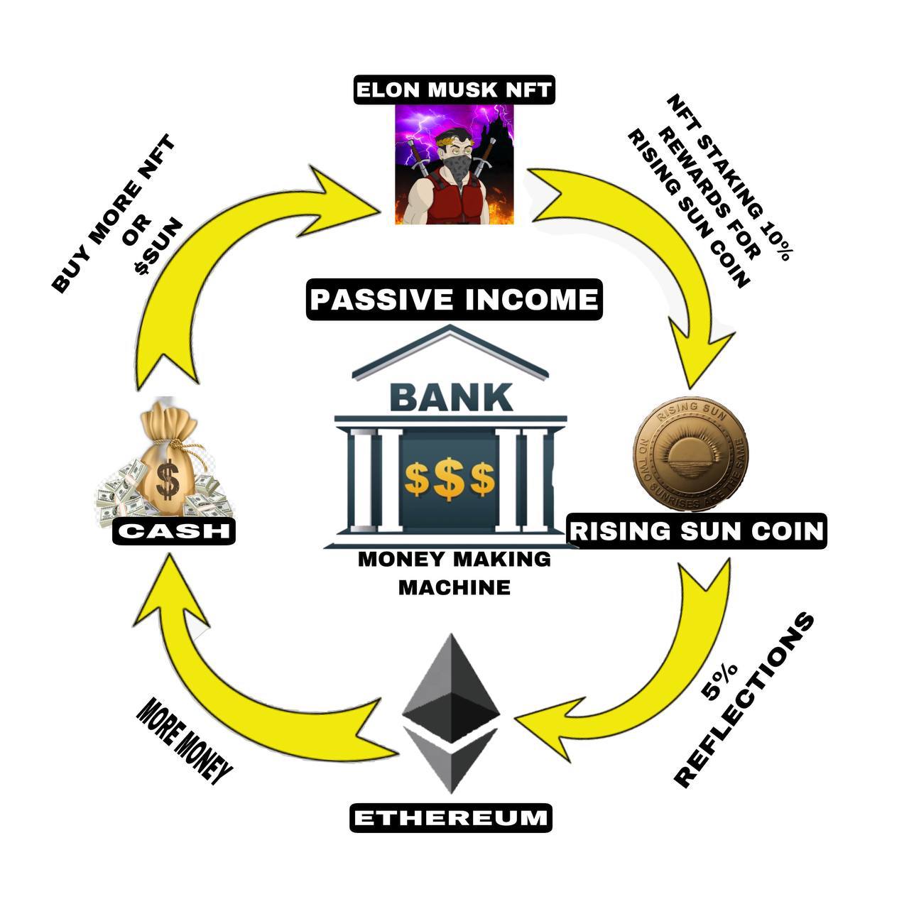 We strongly believe in diversification so you have the option to stake your NFT and receive 10% reflections, which will add to your Rising Sun tokens. The second part of diversification is referring 3 friends and receiving an NFT, for free. Once you purchase 10 or more NFTs, you will receive a plaque and a certificate of authenticity. You can also make money through capital appreciation, which can be used to add to your net worth while your reflections increase, which may result in receiving an actual paycheck.